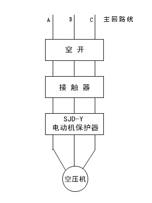 在安裝時,先有三個主回路線進(jìn)空開,從空開出來后接接觸器,從接觸器出來后接電動機(jī)保護(hù)器,從保護(hù)器出來后接空壓機(jī)。